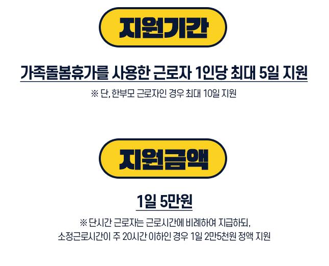 가족 돌봄 휴가는 만 8세 이하 또는 초등학교 2학년 이하 아동을 양육하는 근로자는 정부에서 인당 최대 5일, 1일 5만원씩(부부합산 10일, 50만 원)을 지원해 줍니다. 그 외에는 무급입니다.