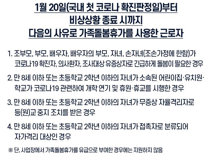 * 만 8세 이하 또는 초등학교 2학년 이하의 자녀가 소속된 어린이집, 유치원, 학교가 코로나19 관련하여 개학 연기 및 휴원·휴교를 시행한 경우