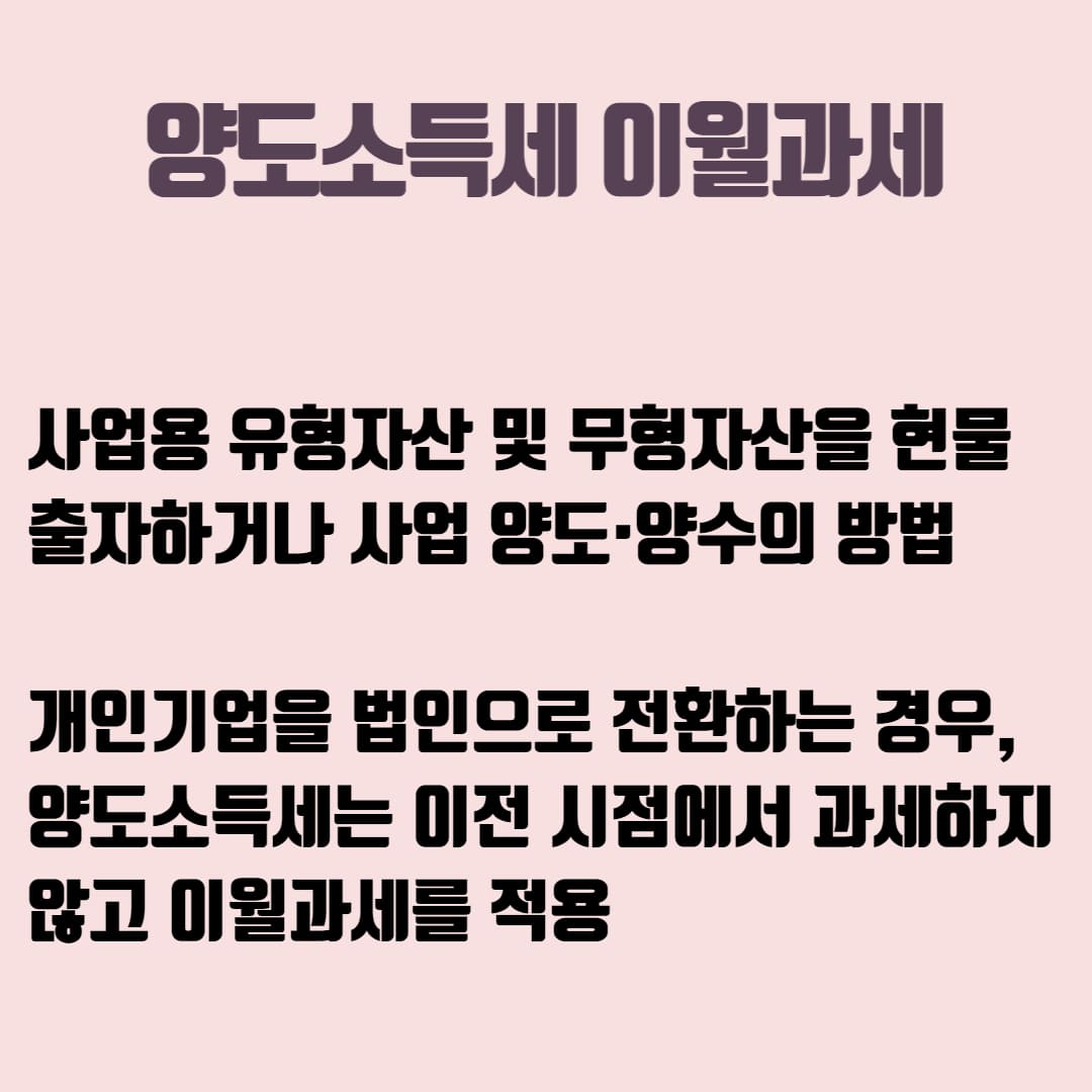 사업용 유형자산 및 무형자산을 현물출자하거나 사업 양도·양수의 방법으로 개인기업을 법인으로 전환하는 경우, 양도소득세는 이전 시점에서 과세하지 않고 이월과세를 적용받을 수 있습니다. 이 말은 바로 세금을 내야 하는 것이 아니라, 미래에 세금을 납부해야 한다는 의미입니다. 이로써 초기 전환 과정에서의 경제적 부담을 줄일 수 있습니다.