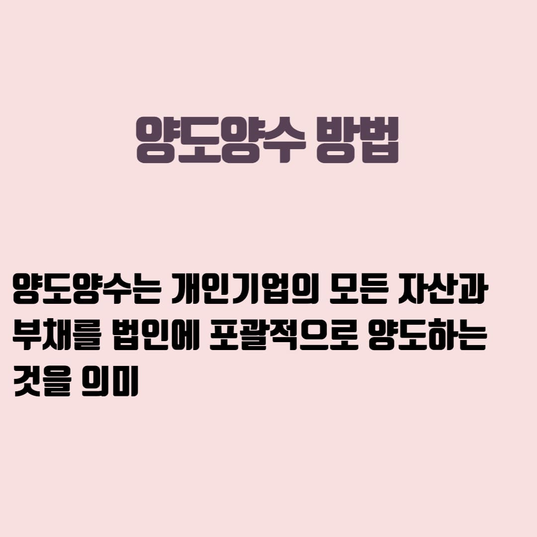 양도양수는 개인기업의 모든 자산과 부채를 법인에 포괄적으로 양도하는 것을 의미합니다. 쌍방간에 적정한 가격이 형성되기만 하면 용이하게 전환할 수 있으므로 실무적으로는 양도양수 방법을 많이 선호합니다.