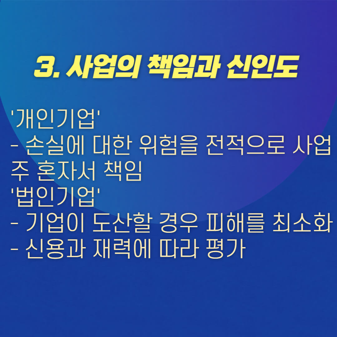 '법인기업'의 경우 주주는 출자한 지분의 한도 내에서만 책임을 지므로, 기업이 도산할 경우 피해를 최소화 할 수 있습니다. 대외신인도 면에서는, 개인기업의 신인도는 사업자 개인의 신용과 재력에 따라 평가받으므로 법인기업보다는 현실적으로 낮다고 보아야 합니다.