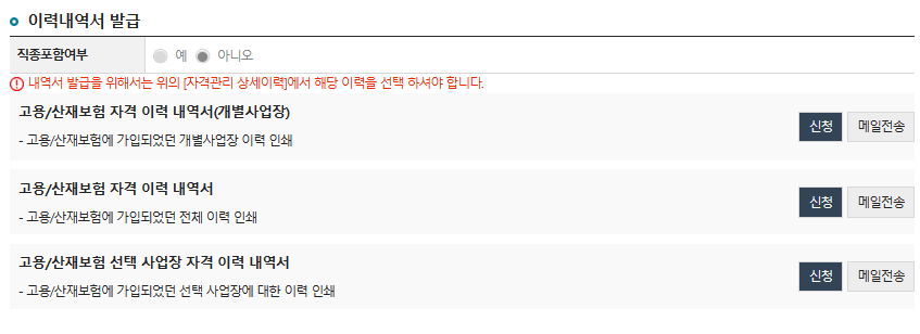 이력내역서 발급은 자격관리에서 해당 이력을 선택한 뒤  신청을 해주셔야 하는데 메일전송을 원하시면 메일전송을 클릭해 주시기 바랍니다.