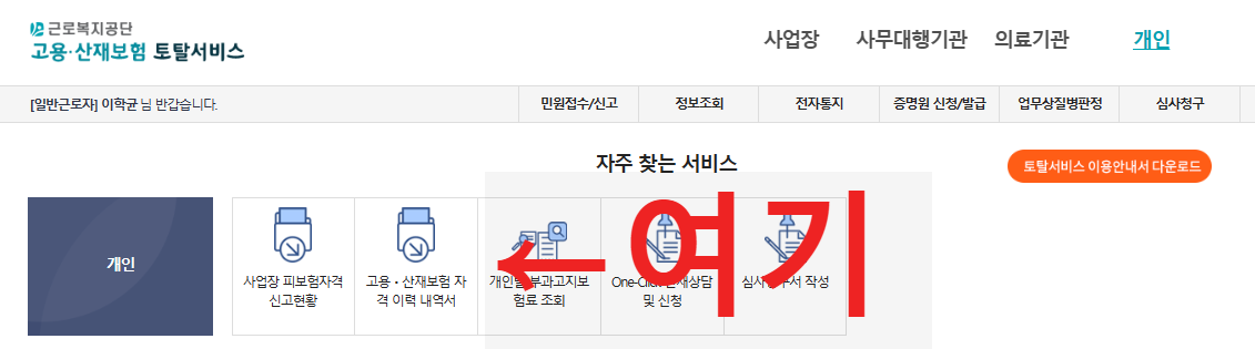 로그인을 마치고 홈화면으로 바뀌는데 고용, 산재보험 자격 이력내역을 클릭합니다.