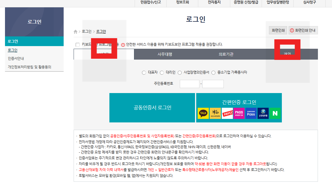 사업장일 경우에는 사업장 로그인 양식에 맞춰 로그인을 해주시고 개인의 경우에는 맨 오른편 개인을 클릭한 뒤 공인인증서 로그인을 실시하여 줍니다.
