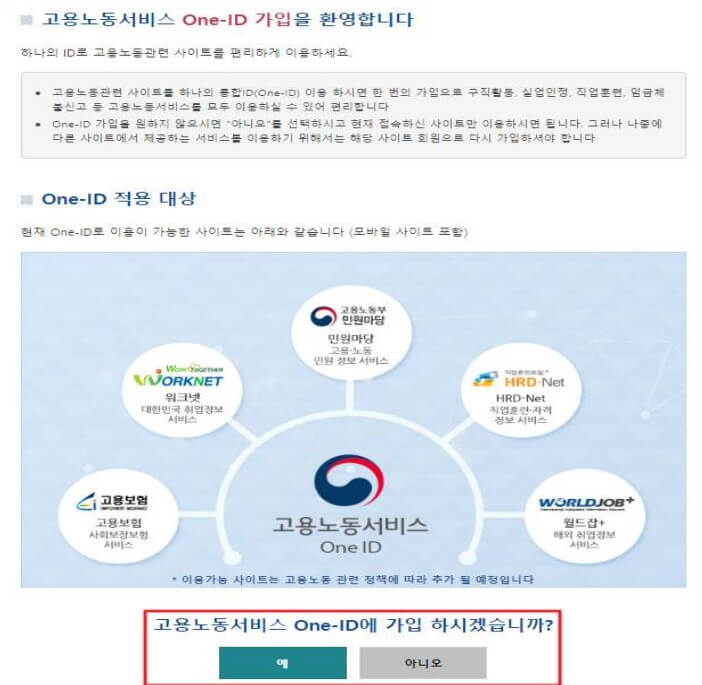 One-ID를 통해 '워크넷', '고용보험시스템', 'HRD-Net', '민원마당', '월드잡+' 등의 고용노동 관련 사이트를 하나의 통합 ID로 이용할 수 있습니다. One-ID 가입을 원하시면 '예'를, HRD-Net만 회원가입을 원하시면 '아니오'를 선택하십시오.