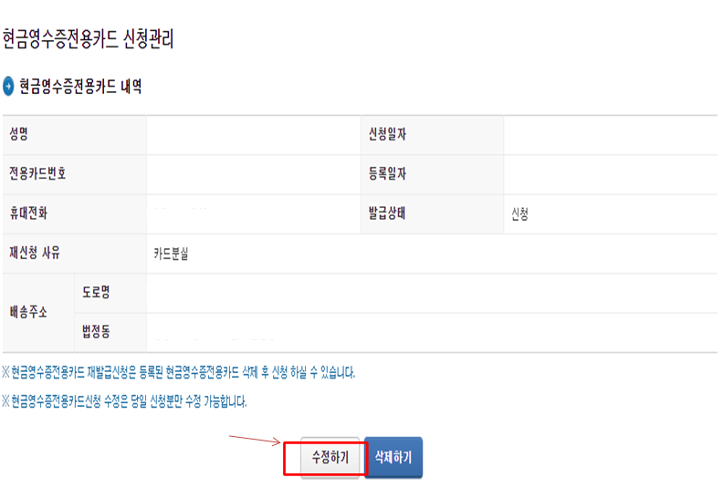 현금영수증 신청관리 창에 들어가시면 현금영수증카드 내역을 확인할 수 있습니다. 이사를 가서 주소를 옮기 셨으면 꼭 수정하기를 클릭하여 주소를 변경해주시기 바랍니다.