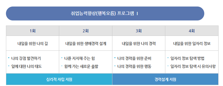취업능력향상(행복오름) 프로그램 I은 매회 1.5시간 동안 특강 형태로 진행됩니다. 심리적 자립과 효율적 경력설계 노하우 습득을 지원하여 참가자가 더 나은 삶을 설계할 수 있도록 돕습니다.