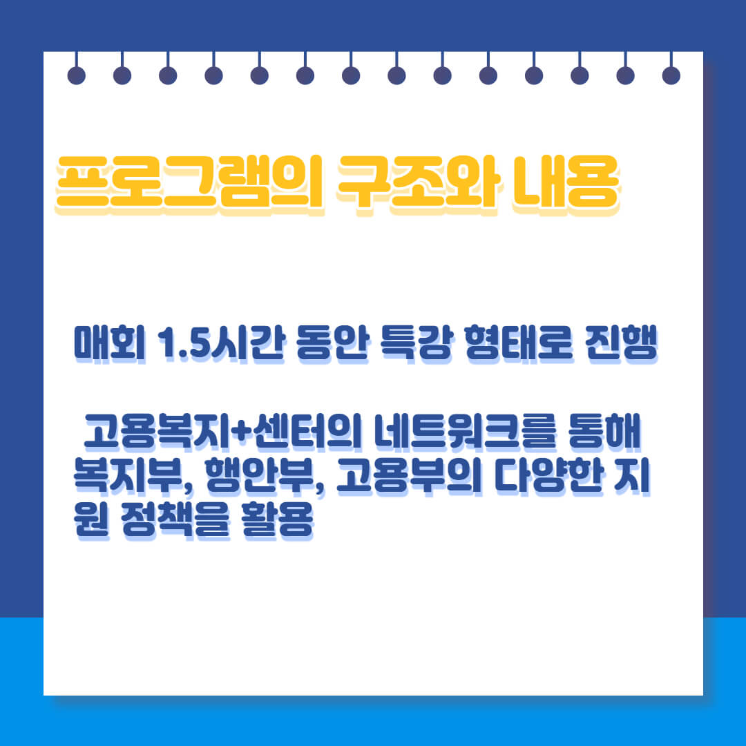 프로그램을 완료하면 참가자는 고용복지+센터의 네트워크를 통해 복지부, 행안부, 고용부의 다양한 지원 정책을 활용할 수 있게 됩니다. 이는 참가자가 자신의 취업 경로를 성공적으로 계획하고 구축하는데 큰 도움을 줍니다.