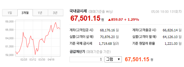 2020년 5월 8일 기준으로 국내 금세세 매매기준율로 보았을 때 금 1g당 = 67,501원을 확인할 수 있습니다. 3.75g(한돈)의 기준 시세는 253,129원으로 1년전 금 최저가 기준 금 1g당 = 48,666원으로 무려 2만원 가량 오른것을 확인할 수 있습니다. 그만큼 금 시세가 상승했다는 것인데요 국제 경제위기가 오면서 안전자산에 관심을 가지고 투자를 하는 사람들이 증가했다는 추세이지요.