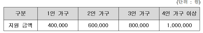 1인가구는 40만원, 2인가구 60만원, 3인 가구 80만원, 4인 가구 이상은 100만원을 지급합니다.
