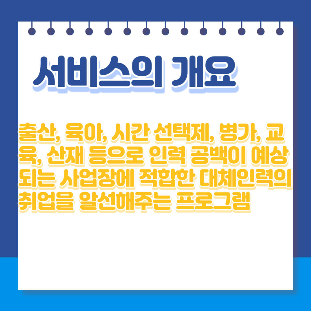 대체인력 서비스는 출산, 육아, 시간 선택제, 병가, 교육, 산재 등으로 인력 공백이 예상되는 사업장에 적합한 대체인력의 취업을 알선해 주는 프로그램입니다.