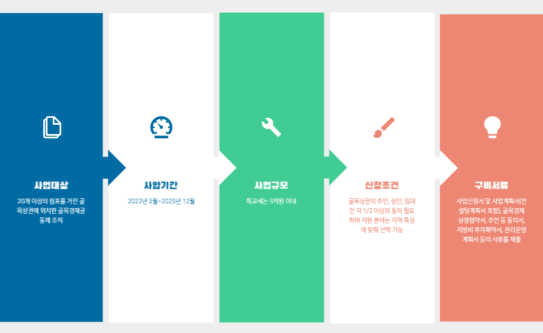 - 신청조건: 골목상권의 주민, 상인, 임대인 각 1/2 이상의 동의 필요하며 지원 분야는 지역 특성에 맞춰 선택 가능