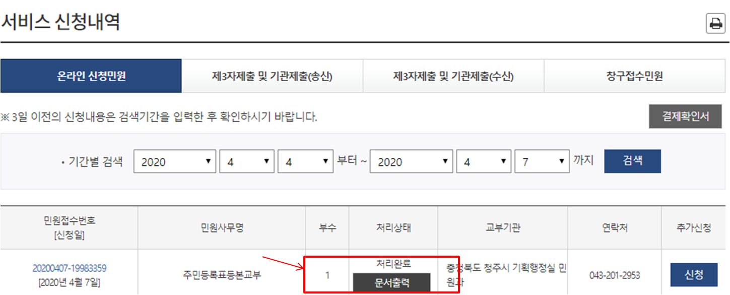 서비스 신청내역 창이 뜨면 발급신청 처리상태에 처리완료가 떠있으면 문서출력 버튼을 눌러주세요.