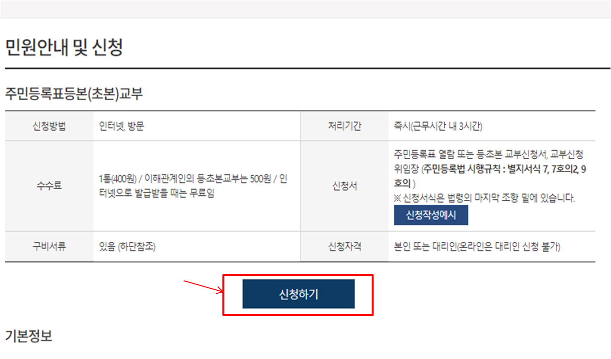 정부24 홈페이지를 바로 들어가서 로그인 후 주민등록등본 신청도 가능하지만 검색창에 주민등록등본을 검색하면 민원신청하기를 누르시면 바로 신청할 수 있는 창으로 나타나납니다.