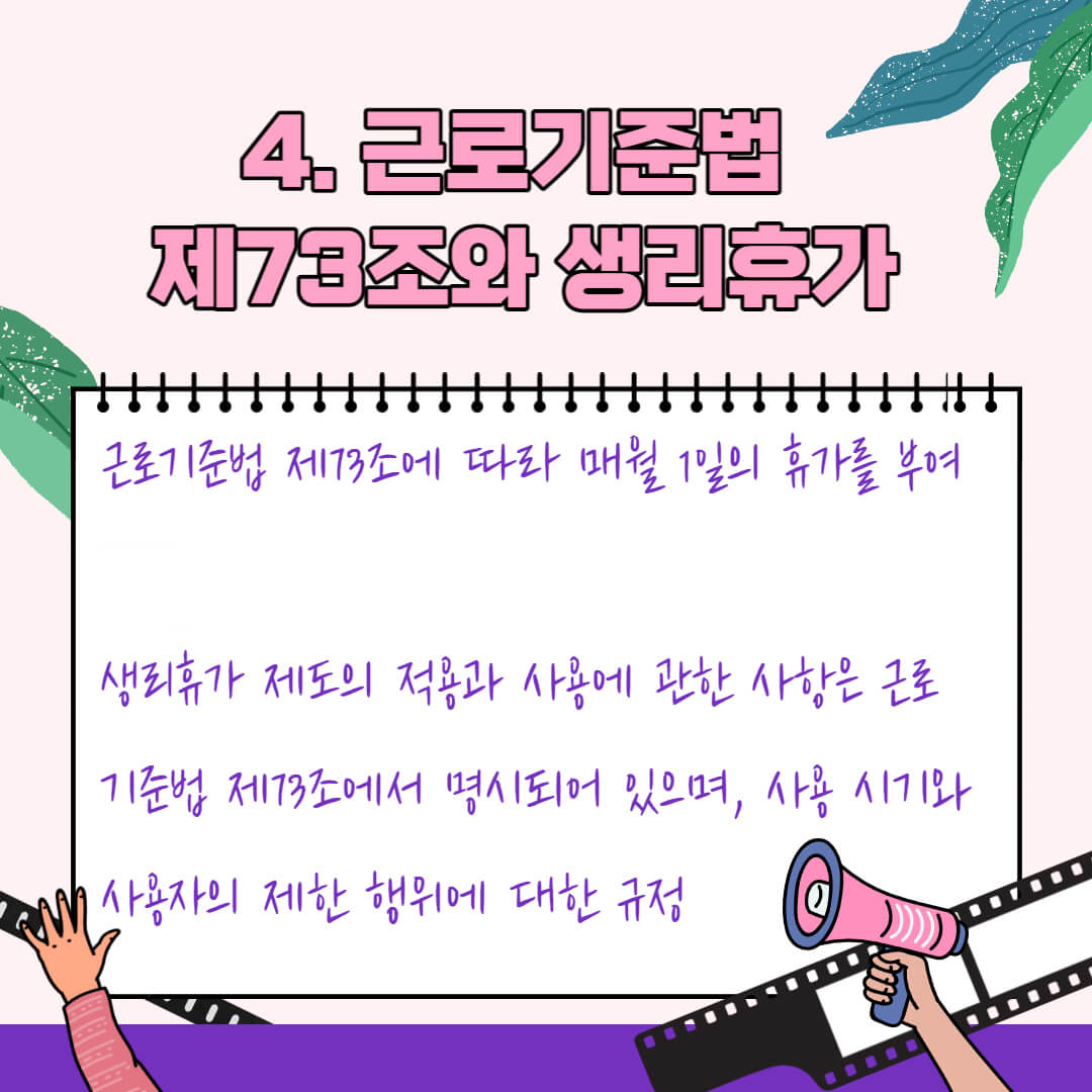 생리휴가 제도의 적용과 사용에 관한 사항은 근로기준법 제73조에서 명시되어 있으며, 사용 시기와 사용자의 제한 행위에 대한 규정이 있습니다. 생리휴가를 사용하는 근로자는 월 1일의 생리휴가를 주어야 하며, 사용 시에는 미리 통보해야 합니다. 또한, 사전 통보 없이 일방적인 사용은 권리의 남용으로 간주될 수 있습니다.