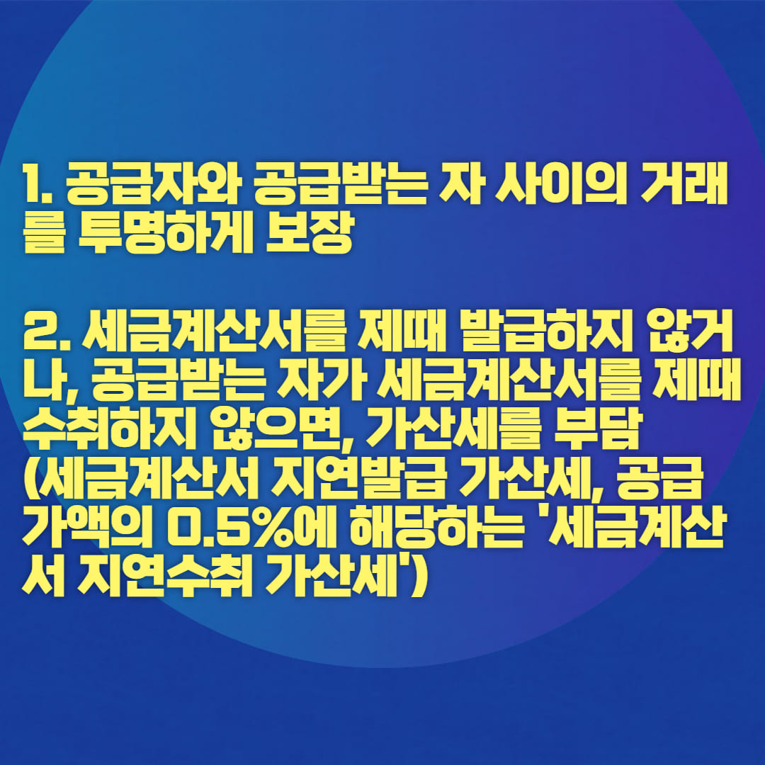 세금계산서는 공급자와 공급받는 자 사이의 거래를 투명하게 보장하고, 정부의 세금 수입을 확보하는 중요한 수단입니다. 공급자가 세금계산서를 제때 발급하지 않거나, 공급받는 자가 세금계산서를 제때 수취하지 않으면, 가산세를 부담하게 됩니다. 이는 공급가액의 1%에 해당하는 '세금계산서 지연발급 가산세', 공급가액의 0.5%에 해당하는 '세금계산서 지연수취 가산세' 등으로 이루어집니다. 이와 같이 세금계산서 제도는 공급자와 공급받는 자 모두에게 세금의 정확한 납부를 유도하고 있습니다.