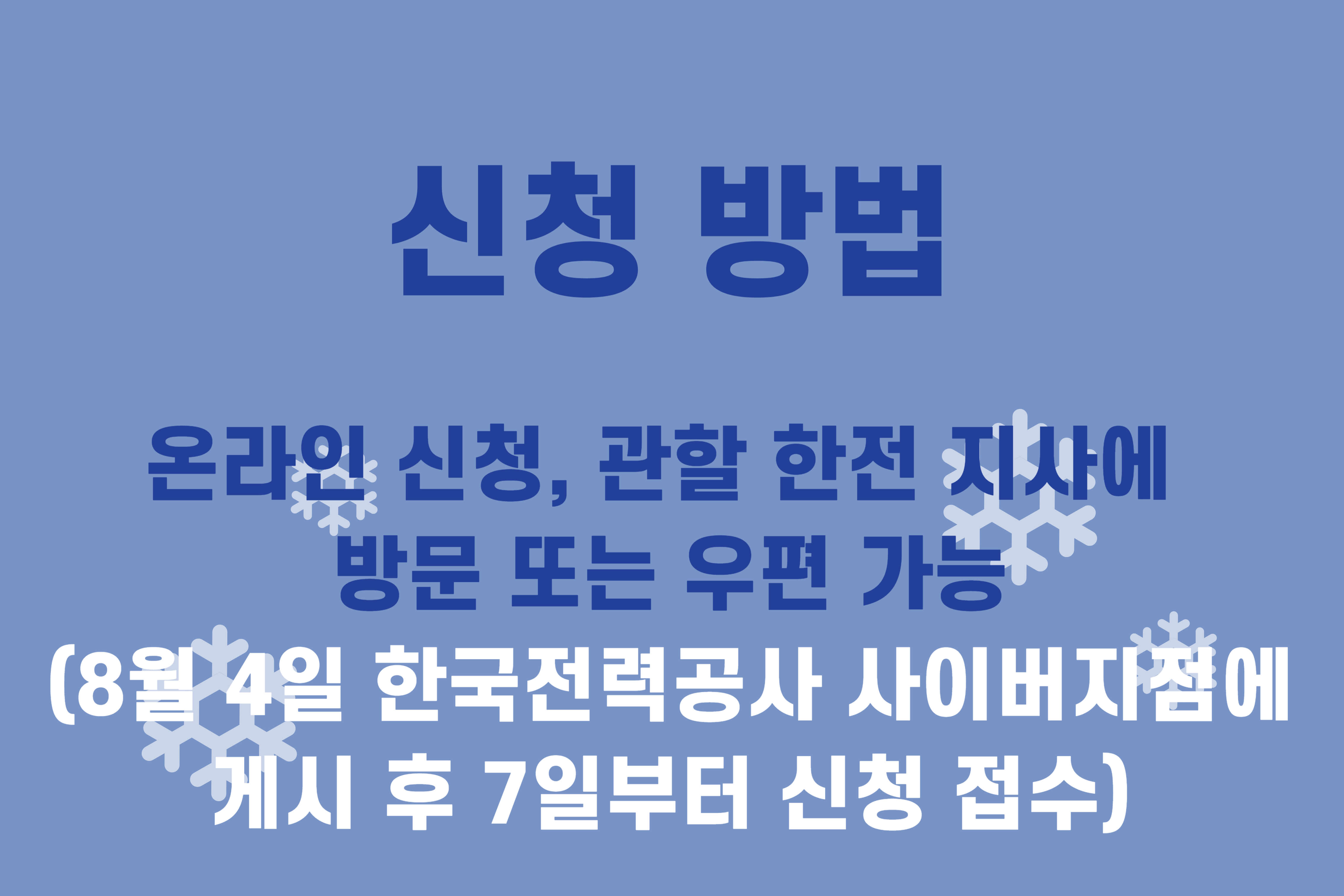 지원을 희망하는 사람은 한전 사이버지점에서 온라인 신청을 할 수 있으며, 관할 한전 지사에 방문하거나 우편으로 신청서를 제출하는 방법도 가능합니다. 신청서와 함께 소기업, 소상공인 확인서, 문 유리 성능 증빙, 사업 전후 현장 사진, 설치(구매) 증빙 등의 증빙서류가 필요합니다.