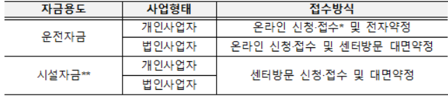 ‣ 접수방법: (운전자금) 온라인 신청 / (시설자금) 지역센터 방문신청