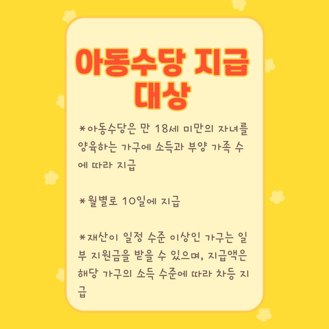 아동수당 지급 대상은 만 18세 미만의 아동을 양육하고 있는 가정이며, 기준은 가구의 소득과 부양가족 수에 따라 달라집니다. 기본적으로는 월평균 소득이 기준액 이하인 가구에 지급되며, 만 18세 미만 자녀가 있는 경우 추가적인 지원금이 지
