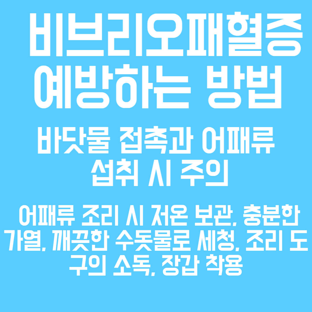 비브리오패혈증 예방을 위한 가장 좋은 방법은 바닷물 접촉과 어패류 섭취 시 주의를 기울이는 것입니다. 피부에 상처가 있는 사람은 바닷물 접촉을 피하고, 어패류를 섭취할 때에는 충분히 익혀서 먹는 것이 중요합니다. 또한 어패류 조리 시 저온 보관, 충분한 가열, 깨끗한 수돗물로 세청, 조리 도구의 소독, 장갑 착용 등이 필요합니다.