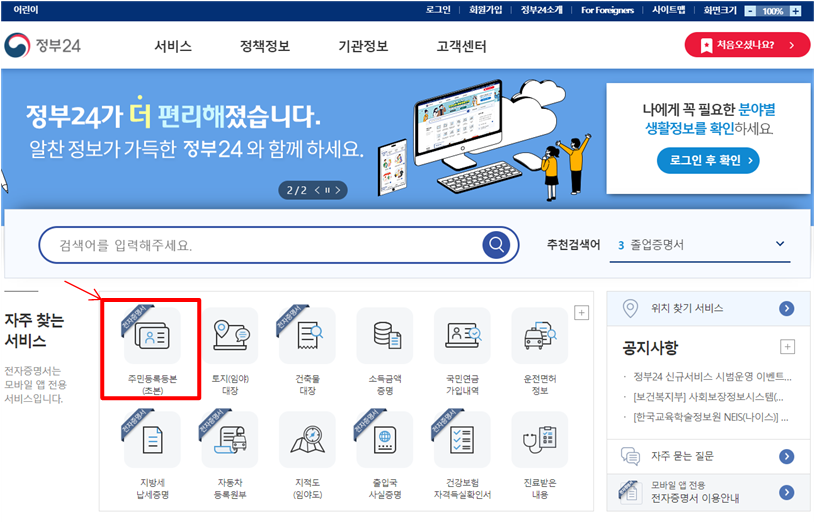 네이버, 다음, 구글 같은 검색 사이트에서 "민원24", "정부24", "영문 주민등록등본"을 검색하여 정부24 홈페이지를 들어가주시면 됩니다.