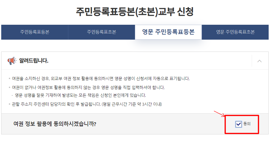 영문 주민등록표등본을 클릭한 뒤 여권정보 활용에 동의를 해주셔야 발급이 가능하니 동의를 눌러주시면 자동으로 영문이름이 입력이 됩니다. 동의를 하지 않을 시 본인이 직접 기입을 해주셔야 합니다. 영문성명과 생년월일을 정확하게 확인을 하시고 수령방법은 온라인발급으로 되어 있는지 확인해주시기 바랍니다.