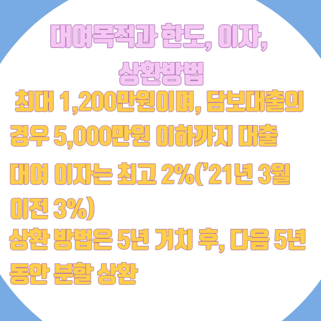 무보증 대출의 한도는 가구당 최대 1,200만원이며, 담보대출의 경우 5,000만원 이하까지 대출이 가능합니다. 대여 이자는 최고 2%(’21년 3월 이전 3%)이며, 상환 방법은 5년 거치 후, 다음 5년 동안 분할 상환하는 방식입니다.