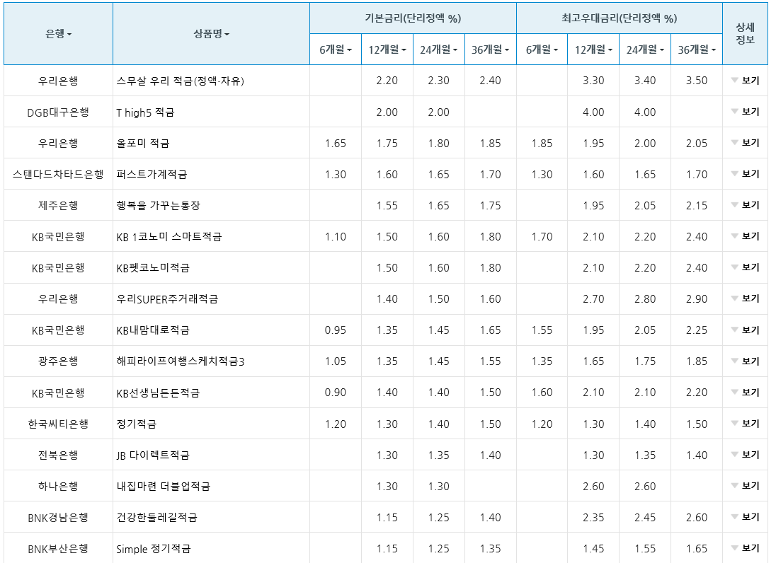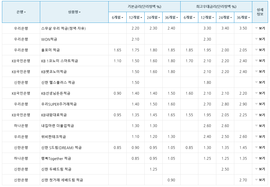 24개월(2년) 단기 정액적립식 기준으로 1~3위까지는 우리은행 스무살 우리 적금, WON 적금, 올포미 적금이 가장 높은 금리로 나타났습니다. 가장 높은 금리가 2.30%라는 것을 보았을때 1금융권에서는 가장 높은 금리를 가진 적금 상품이 아닐까 싶은데요. 하지만 우대조건을 만족한다면 최고 3.40%의 높은 금리를 받으실 수 있습니다.