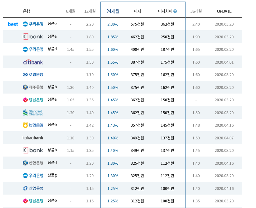 이 또한 24개월(2년) 단기 정액정립식을 기준으로 우리은행이 가장 높은 금리를 볼 수 있는데요 0%대 저금리 시대를 맞이 하여 현실적으로 은행 상품을 통해 이자를 통한 수익은 기대하기는 어렵다고 생각합니다. 그래서 사람들도 은행에서 예금, 적금을 망설이는 분들도 있을 것입니다.