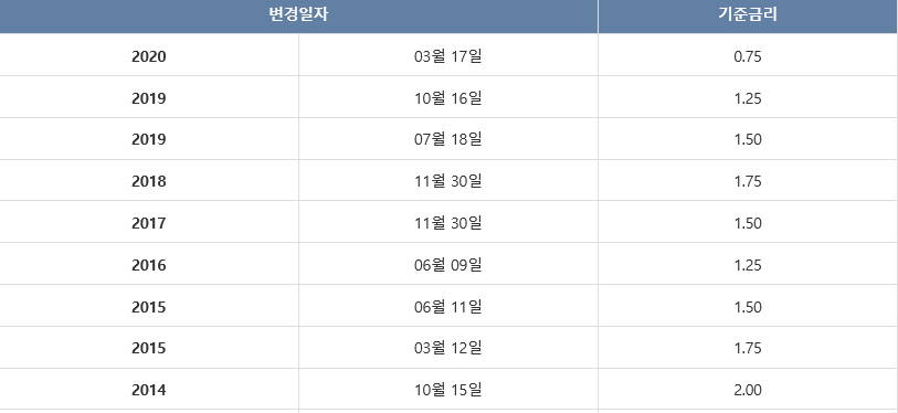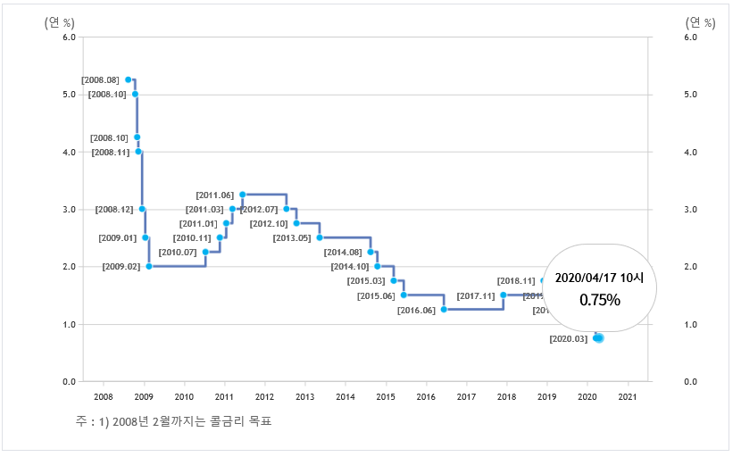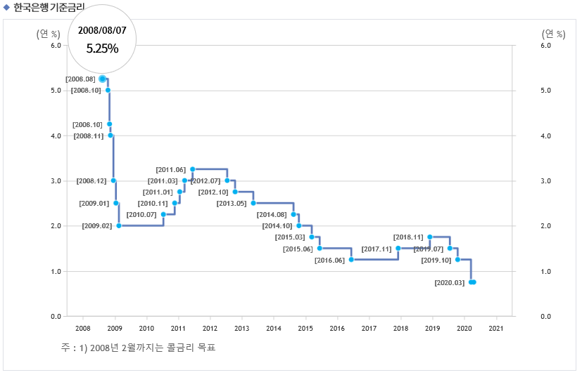 한국은헹에서는 물가 동향, 국내외 경제 상황, 금융시장 여건 등을 종합적으로 고려하여 연 8회 기준금리를 결정하고 있는데 2020년 3월 기준 기준금리 0.75%가 나타났습니다. 기준금리의 변동에 따라 시장금리, 예금 및 대출 금리 등 변동으로 이어져 실물경제 활동에 대해 영향을 미치게 됩니다.