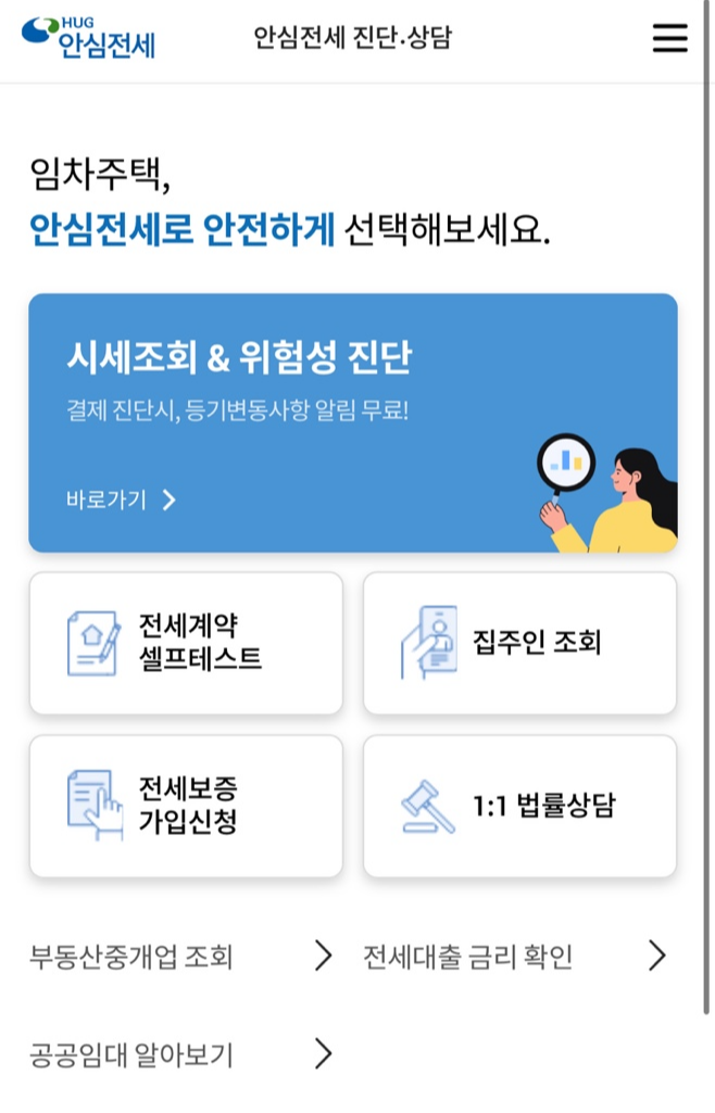 또한 HUG에서 사내 변호사 등을 통해 1:1 법률상담을 무료로 제공함으로써 전세계약과 관련한 임차인 고충을 해결할 수 있도록 지원하고, 위험 중개사 등을 피할 수 있도록 공인중개사의 영업 여부, 등록 정보 등 관련 정보를 조회하는 기능이 제공되며, HUG 전세금반환보증 가입도 「안심전세 App」을 통해 신청할 수 있습니다.