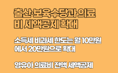 마지막으로, 출산 및 보육수당에 대한 소득세 비과세 한도는 월 10만원에서 20만 원으로 확대됩니다. 또한, 영유아 의료비에 대해서는 한도 없이 전액 세액공제를 받을 수 있도록 하였고, 산후조리비용도 200만 원 한도 내에서 급여에 상관없이 세액공제를 받을 수 있게 되었습니다.