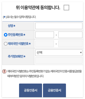 발급받으시기 전 공동인증서, 금융인증서 등의 인증서가 필요로 합니다.
