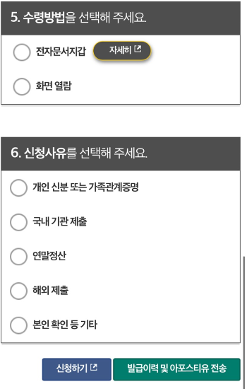 5. 입력을 마치시면 발급 대상자, 증명서 종류, 주민등록번호(뒷자리)공개, 수령방법을 확인하시고 체크한 뒤 신청하기를 누르시면 가족관계 증명서 발급이 완료가 됩니다.