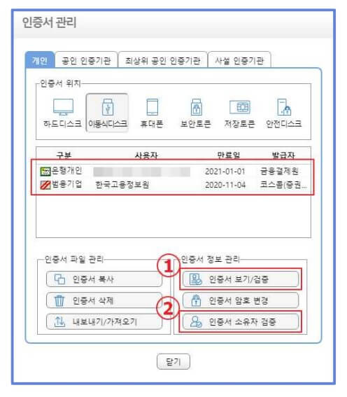 만약 공인인증서 등록 과정에서 오류가 발생하였다면, '인증서 관리버튼을 클릭하여 인증서 관리 화면으로 이동합니다해당 화면에서 문제가 발생한 공인인증서를 클릭하고 '인증서 보기/검증버튼을 클릭하면 인증서의 상태를 확인할 수 있습니다만약 '사용가능상태가 아니라면인증서 발급 기관에 문의하여 해결해야 합니다.