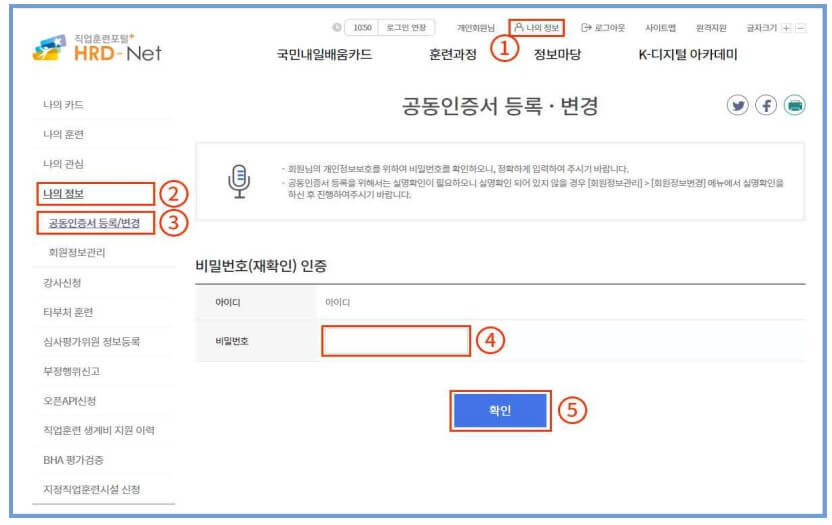 먼저, HRD-Net 홈페이지에 로그인한 후, '나의정보' > '나의정보' > '공인인증서 등록/변경' 메뉴로 이동합니다이후본인인증 재확인을 위해 로그인 비밀번호를 입력하고 '확인버튼을 클릭합니다.