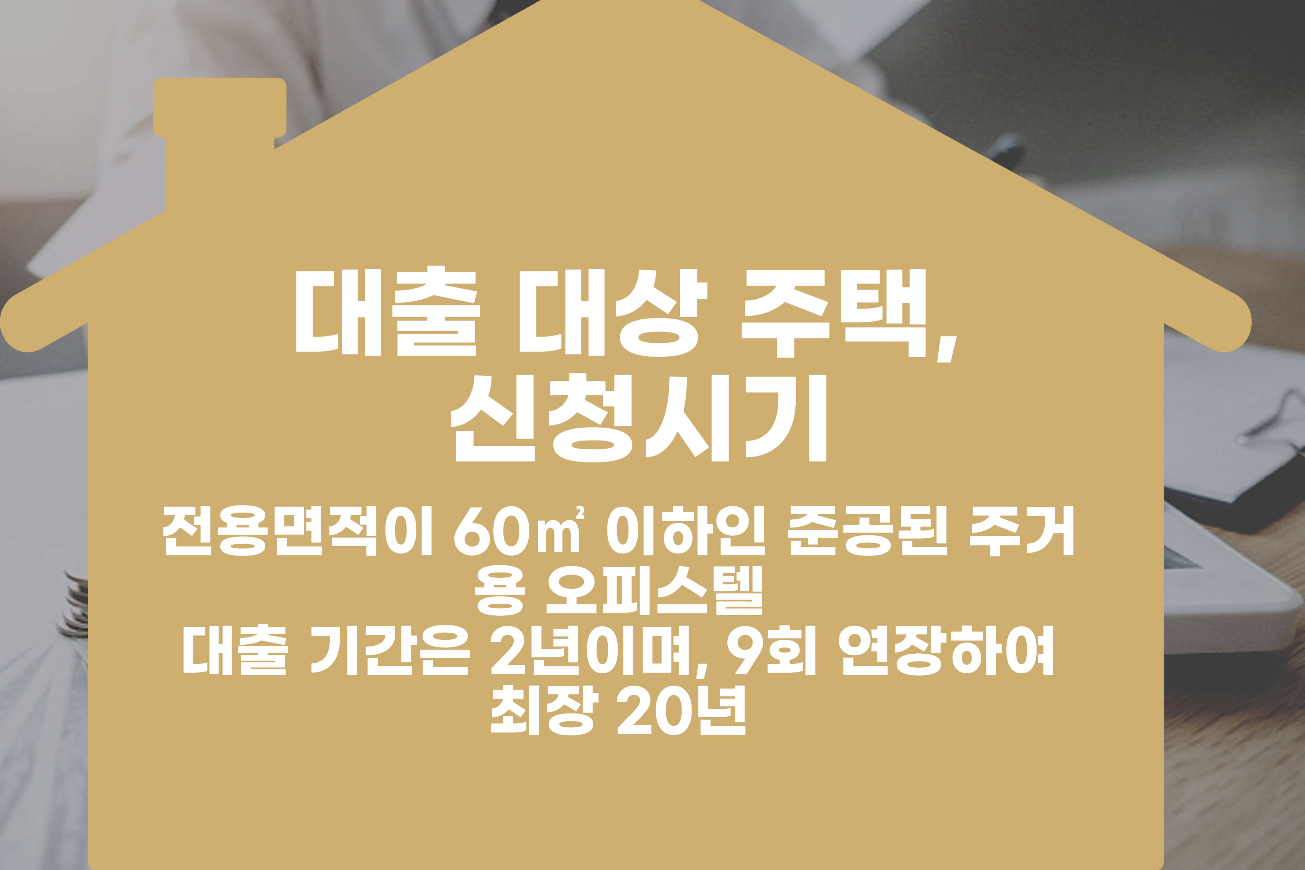 대출 대상은 전용면적이 60㎡ 이하인 준공된 주거용 오피스텔이며, 오피스텔 가격이 1억 5천만 원 이하인 경우에 한정됩니다. 대출 기간은 2년이며, 9회 연장하여 최장 20년까지 이용 가능합니다. 대출 신청은 소유권 이전 등기 전에 해야 하며, 소유권 이전등기를 한 경우에는 이전등기 접수일로부터 3개월 이내에 신청해야 합니다.