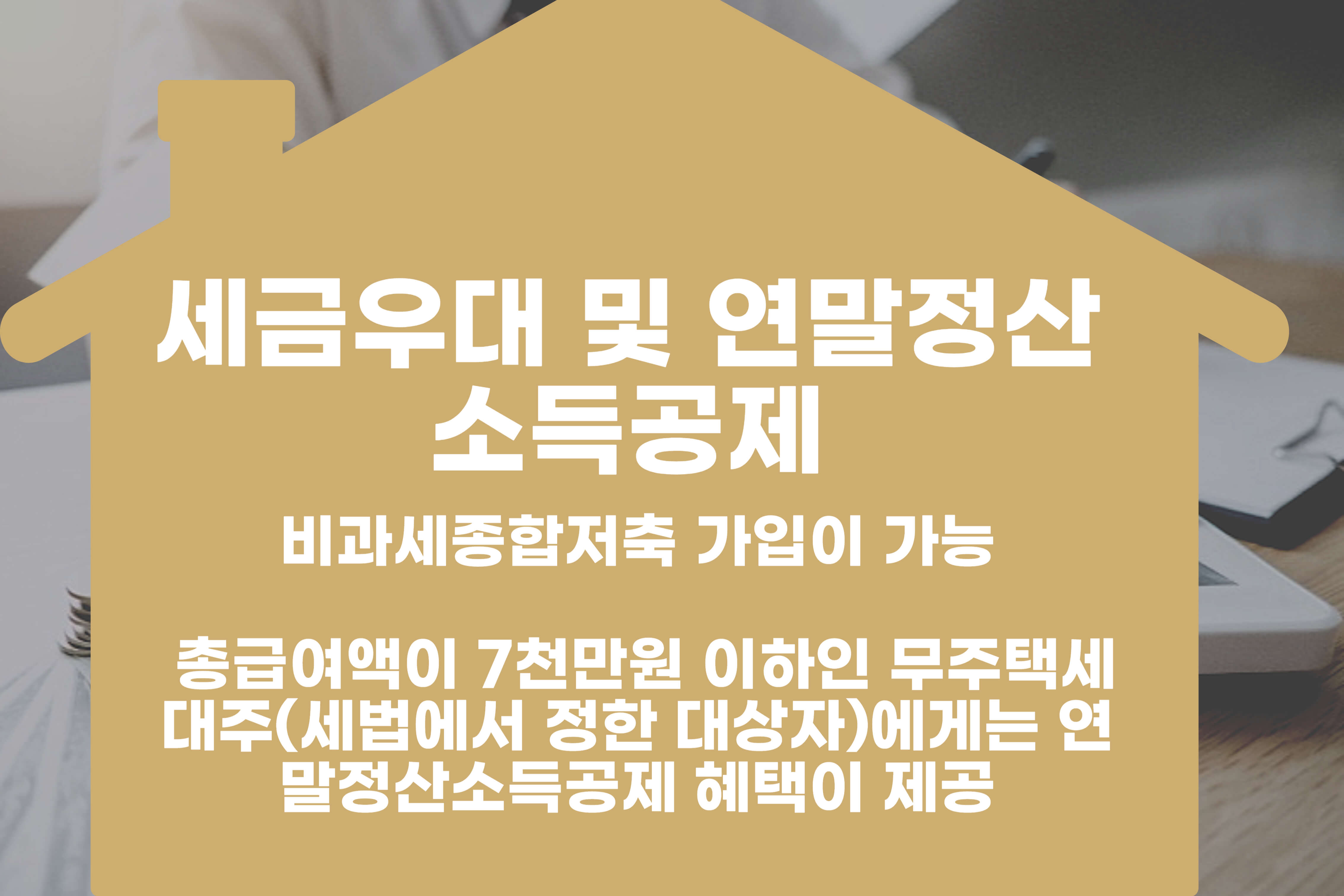 비과세종합저축 가입이 가능하며, 본인한도 내에서 입니다. 또한 가입자가 사망한 경우에는 그 상속인의 명의로 변경 신청이 가능합니다. 2015.1.1일 납입일부터 개정된 세법 적용으로, 총급여액이 7천만 원 이하인 무주택세대주(세법에서 정한 대상자)에게는 연말정산소득공제 혜택이 제공됩니다. 소득공제는 해당 과세연도 납 부분(연간 240만 원 한도)의 40%(96만 원 한도)입니다.