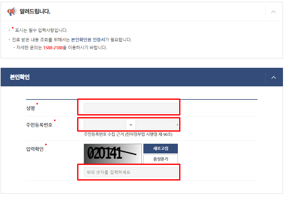 공인인증서 로그인을 마치면 본인확인을 위해 성명, 주민등록번호, 입력확인을 기입을 하는 창이 뜹니다. 정확하게 자신의 성명, 주민번호, 입력확인을 기입해주시기 바랍니다. *표시는 필수 입력사항이니 꼭 기입해야 합니다.
