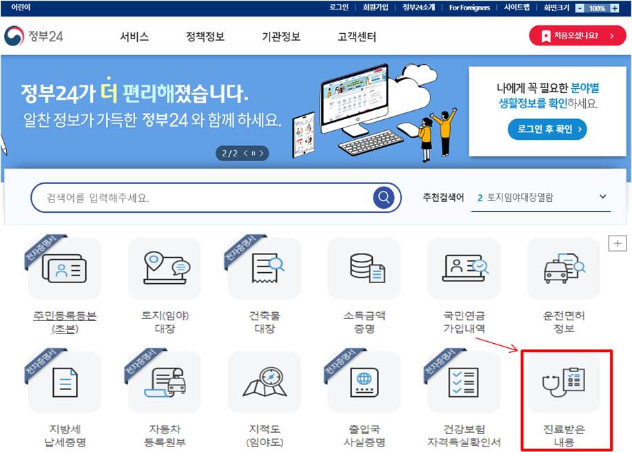 홈페이지에 접속하셨으면 간편서비스에서 진료받은 내용을 확인하신 뒤 클릭 후 들어가주시기 바랍니다.