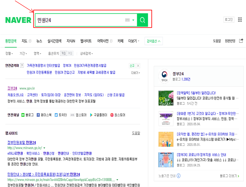 검색사이트에서 "민원24", "정부24"를 검색하여 정부24홈페이지에 접속해주시기 바랍니다.