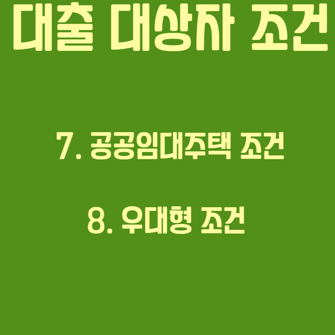대출접수일 현재 공공임대주택에 입주하고 있는 경우 대출을 받을 수 없습니다. 다만, 대출신청 물건지가 해당 목적물인 경우 또는 대출신청인 및 배우자가 퇴거하는 경우에는 대출이 가능합니다.