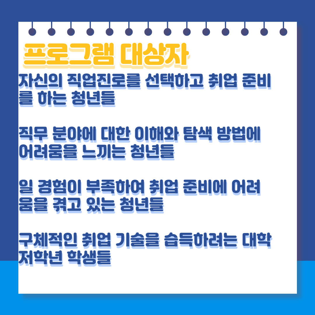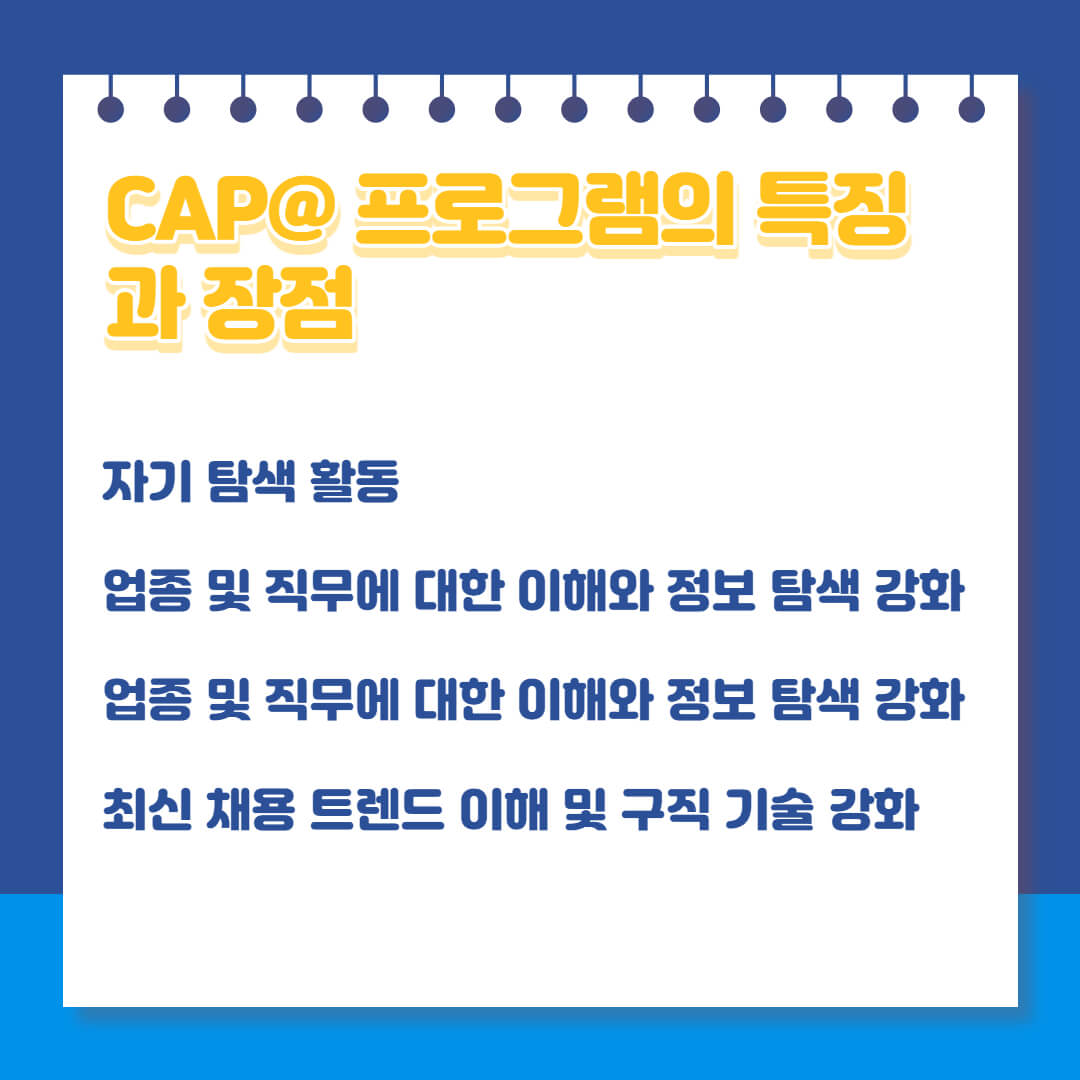 CAP@ 프로그램은 청년 취업 준비생의 강점 탐색, 업무 및 직무 이해, 취업 서류 작성 및 면접 준비 등 다양한 구직 기술을 강화하는데 초점을 둔 프로그램입니다.