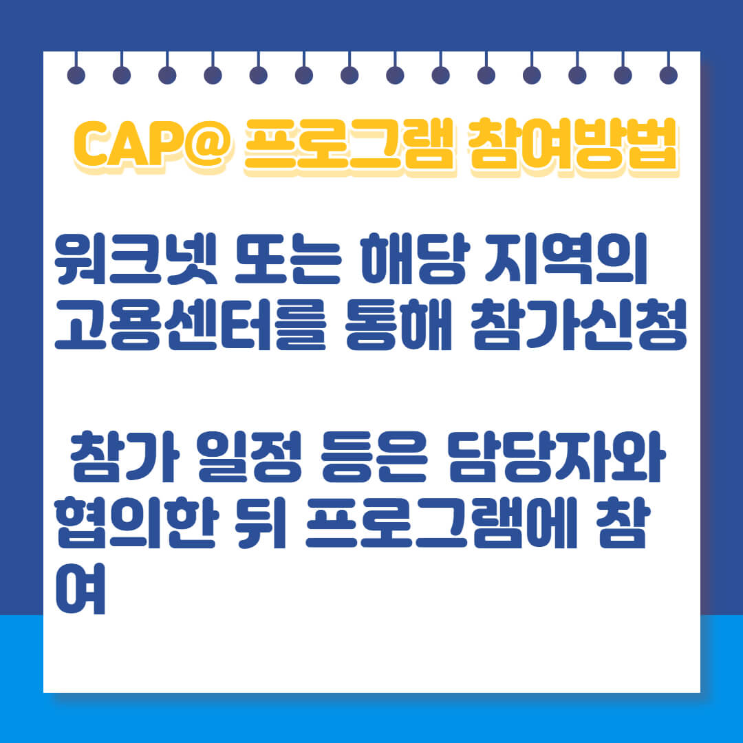 청년구직자가 CAP@ 프로그램에 참여하려면 워크넷 또는 해당 지역의 고용센터를 통해 참가신청을 하면 됩니다. 참가 일정 등은 담당자와 협의한 뒤 프로그램에 참여할 수 있습니다. 단체 신청도 가능하며, 이 경우 해당 지역의 고용센터 취업 지원과 직업진로 담당자와 협의하시면 됩니다.