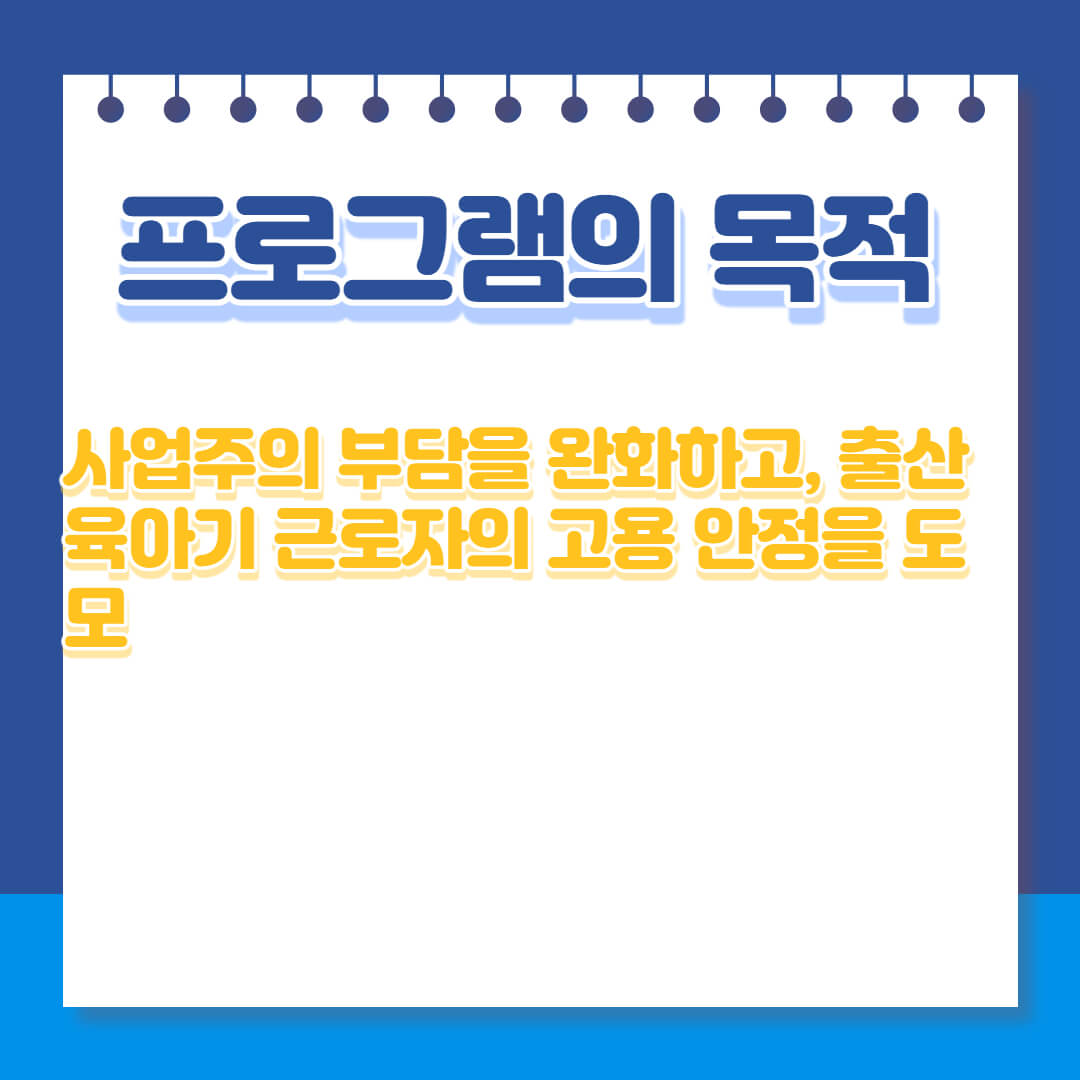 출산전후휴가, 유산·사산 휴가, 육아휴직, 육아기 근로시간 단축 등을 부여(허용)한 사업주에게 간접노무비, 대체인력 인건비 등을 지원하여 사업주의 부담을 완화하고, 출산육아기 근로자의 고용 안정을 도모하는 것이 이 프로그램의 목적입니다.