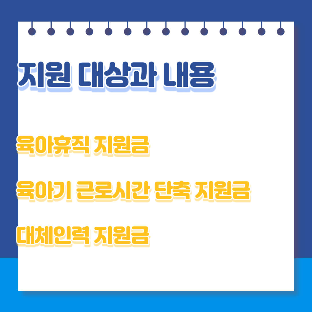육아휴직 지원금 : 근로자에게 육아휴직을 30일 이상 허용한 우선지원대상기업 사업주가 대상입니다. 지원금의 절반은 해당 근로자 업무 복귀 후 6개월 이상 계속 고용한 경우 지급됩니다.
