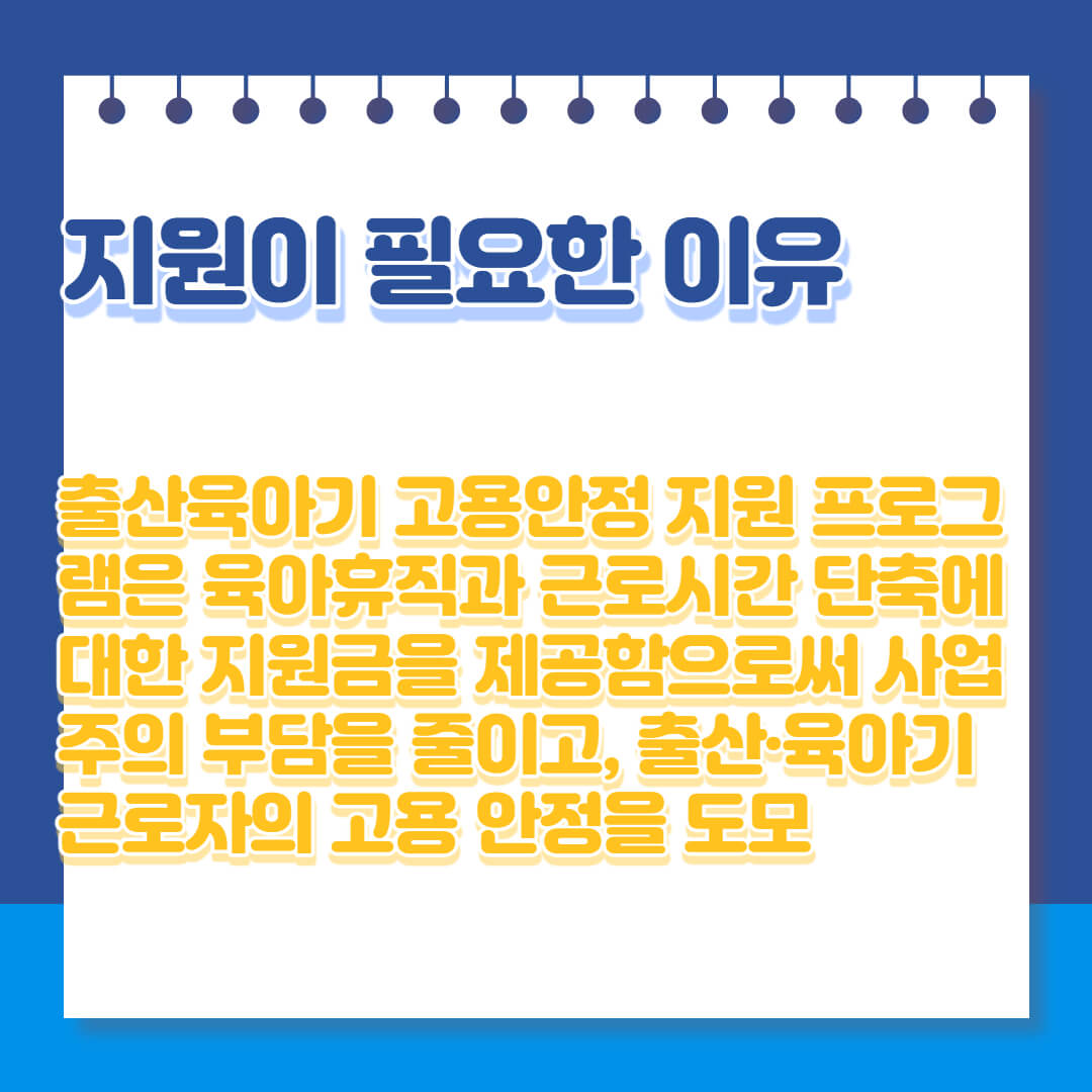출산·육아 기간은 많은 부모에게는 소중한 시간이지만, 사업주에게는 인력 공백으로 인한 어려움이 발생할 수 있습니다. 이러한 문제를 해결하기 위해, 출산육아기 고용안정 지원 프로그램은 육아휴직과 근로시간 단축에 대한 지원금을 제공함으로써 사업주의 부담을 줄이고, 출산·육아기 근로자의 고용 안정을 도모합니다.