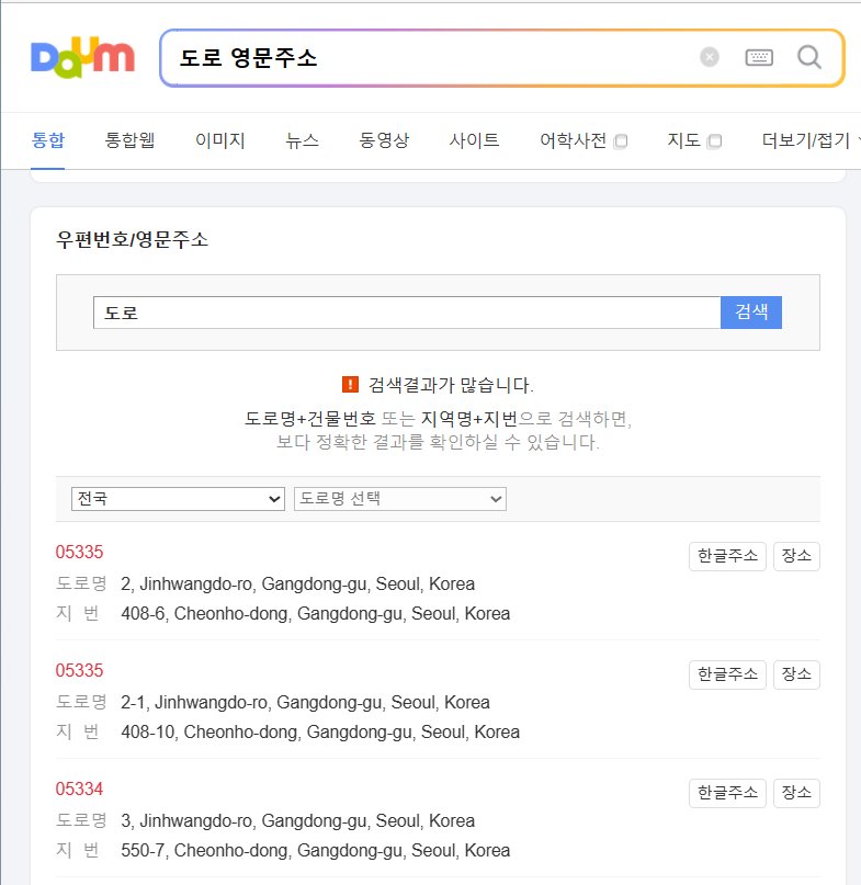 다음 검색창에 "도로 영문주소"를 검색하여 자신의 집주소를 검색하시면 간단하게 확인할 수 있습니다.
