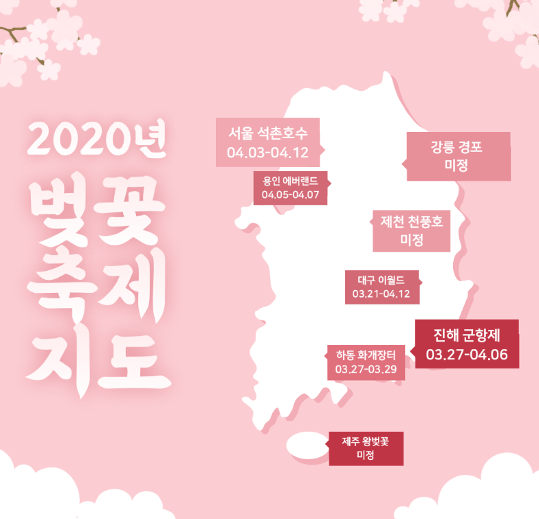2020년 3월입니다. 코로나19로 인해 봄이 다가와도 우리는 봄을 제대로 맞이 할 수 있을까 라는 걱정과 근심이 많으실텐데요 감염의 위험으로 각 지역에서 벚꽃축제를 취소하거나 연기하였는데 사람들이 밀집하지 않은 곳에서 조금만 걸으면 벚꽃을 볼 수 있고 조금이나마 위로를 받을 수 있을거 같네요. 오늘은 2020년 벚꽃 축제와 벚꽃 개화시기에 대해서 말씀드리겠습니다.
