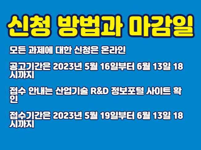 공고기간은 2023년 5월 16일부터 6월 13일 18시까지이며, 신청서 및 관련 양식은 같은 기간 동안 제공됩니다. 신청서 및 양식 교부, 접수 안내는 산업기술 R&D 정보포털 사이트에서 확인하실 수 있습니다.